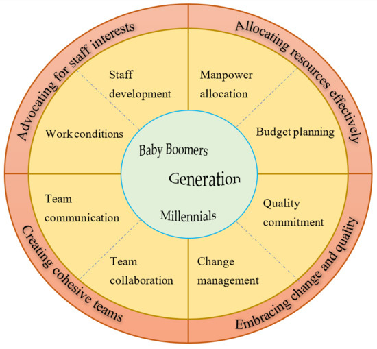 Past relevant studies tended to identify an exhaustive list of dimensions or standards of competency and to conclude that nurse managers need to develop multifaceted abilities to attain managerial success [23]. This study focused on capturing the core elements of the competencies of nurse managers, namely staff advocacy, resource allocation, team effectiveness, and change and quality management. This study also uncovered differences in the views of different generations of nurses on what contributes to managerial success in nursing. The findings shed light on how to lead a multi-generational nursing workforce so as to bring about positive staff and patient outcomes.