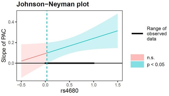 Interactive effect of PAC and rs4680 polymorphism on adolescent depressive symptoms. The green-red line indicates the simple slope of PAC contribute to depressive symptoms. Note: The green line represents the region of significance for the conditional association. Shaded area = confidence interval, PAC = parent-adolescent conflict, n.s. = not significant, the rs4680 value (1 = Val/Val, 0 = Val/Met, Met/Met).