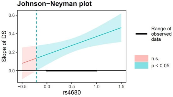 Interactive effect of DS and rs4680 polymorphism on adolescent NSSI. The green-red line indicates the simple slope of DS contribute to NSSI. Note: The green line represents the region of significance for the conditional association. Shaded area = confidence interval, DS = depressive symptoms, n.s. = not significant = CI [−5.47, −0.21], the rs4680 value (1 = Val/Val, 0 = Val/Met, Met/Met).