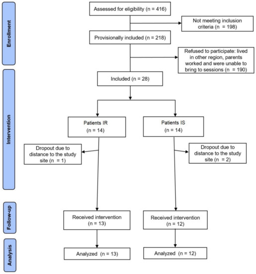 During the visits of the three schools, we evaluated the anthropometry of 416 adolescents, of whom 28 were considered obese and agreed to participate in this study. Among these, 14 had insulin resistance (IR group) and 14 did not (IS). The participants’ flow is shown in Figure 1.