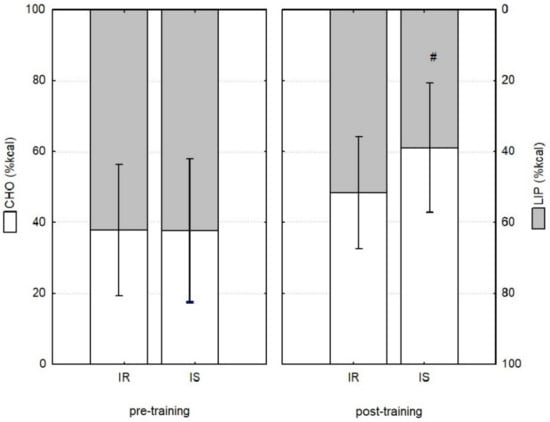 Energy derived from carbohydrates (CHO) and lipids (LIP) pre-and post-training. Mean values ± standard deviation; insulin-resistant (IR, n = 13) and insulin-sensitive (IS, n = 12). # Indicates p < 0.05 versus the period pre-training in the same group.