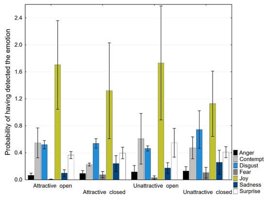 The mean scores of the self-reported emotions of joy, surprise, fear, and sadness were calculated for each category of images (Table 2 and Figure 3). Three-way mixed ANOVAs were conducted to assess the effects of attractiveness, openness, and gender on perceived emotion. Attractiveness (attractive × unattractive), openness (open × closed), and gender (male × female) were chosen as predictors, and the level of self-reported emotion was chosen as a dependent variable.