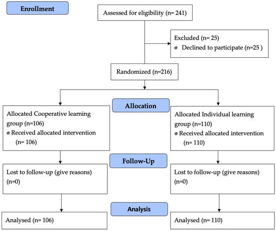 From the 241 initial candidates, a total of 216 future physiotherapy professionals agreed to participate and were analyzed (response rate 89.62%) (Figure 1). The average age of the participants was 21.06 ± 4.76 years; 109 were women (50.5%). A total of 99.6% of the sample wanted to work as a physiotherapist after finishing their studies and 35.6% had family members working in health professions. All of them agreed voluntarily to participate in the study. There were no statistical differences between the groups at the baseline. The demographic and clinical characteristics of the participants by group are depicted in Table 1.
