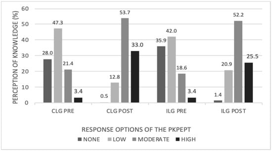 Regarding the response options of the PKPEPT, before the training, both groups showed that more than 25% and 40% of the sample answered that their perception of knowledge regarding professional ethics, was “none”, or “low”, respectively. After the teaching program, at least 50% of the sample in both groups answered “moderate”, highlighting that more than 30% of the CLG stated a “high” perception of ethical knowledge (Figure 2).