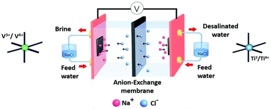 The redox flow desalination cell is similar to the redox flow battery, in which liquid redox electrolytes rather than solid electrode materials are used as the main ion adsorption regions. As shown in Figure 5 [99], the redox desalination system is divided into three compartments by an anion-exchange membrane and a cation-exchange membrane: the cathodic region consists of the cathode and catholyte, the feed solution, and the anodic region consists of the anode and anolyte. However, in some cases, there are still some solid electrode materials on the current collectors. During charging, the solutes in the electrolytes are oxidized or reduced, leading to variations in the valences, thus attracting salt ions through the membranes due to charge compensation. Redox desalination often has a high charge efficiency due to the ion-exchange membranes and fast ion diffusion because of the short ion diffusion path; therefore, low energy consumption is expected [100].