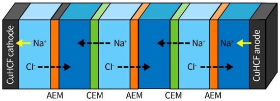 Extremely low energy consumption can be achieved by combining intercalation materials with membrane stacks. As studied by Kim et al. [86], five ion-exchange membranes were introduced into a CDI cell with copper hexacyanoferrate (CuHCF) electrodes, as shown in Figure 4 [86], resulting in an enhanced desalination capacity; thus, energy consumption of 0.01 Wh·gNaCl−1 was observed.