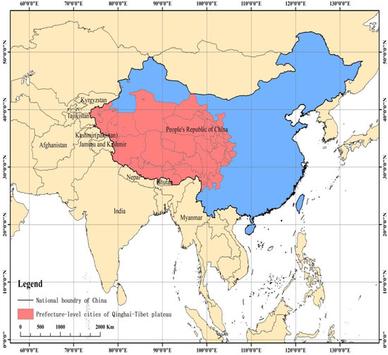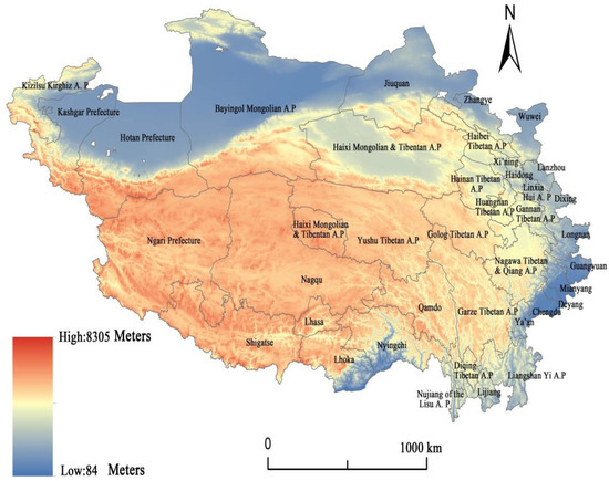 The Qinghai–Tibet Plateau mainly includes seven prefecture-level cities in the Tibet Autonomous Region, eight prefecture-level cities in Qinghai Province, eight prefecture-level cities in Sichuan Province, eight prefecture-level cities in Gansu Province, and four prefecture-level cities in the Xinjiang Uygur Autonomous Region. The latitude and longitude range of the Qinghai–Tibet Plateau is 26°00′12″ N–39°46′50″ N and 73°18′52″ E–104°46′59″ E. It is about 2800 km long from east to west, and 300 to 1500 km wide from north to south (Figure 1), with a total area of about 2.5 million square kilometers, making it the smallest population density in China. It is between 3000–5000 m above sea level, with an average altitude of more than 4000 m (Figure 2). The climate is characterized by strong radiation, abundant sunshine, and a large daily temperature difference. The average annual temperature decreases from 20 °C in the southeast to below −6 °C in the northwest. The water resources are mainly rivers, lakes, and glaciers. The main crops include highland barley and naked barley. The area below 3000 m in the southeast has better hydrothermal conditions, and rice can be planted. There are many ethnic minorities living in the region, including Tibetan, Hui, Naxi, and other ethnic groups. According to the statistics of prefecture-level cities, the GDP reached RMB 2048.123 billion in 2019, of which the tertiary industry accounted for 50.73%, and the population was 73,174,867. The per capita disposable income of urban residents and rural residents was RMB 30,435.21 and RMB 11,630.87, respectively.