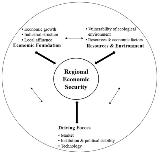 First of all, RE constitutes the regional context of economic development and economic security. Ecology is a key component of national and regional economic security [2,30]. A few researchers have noticed the influence of RE on national economic security and have classified it as an ecological or environmental development factor [2]. According to the theory of the man–land relationship in geography, the natural environment is the material source of human survival and development, and it affects the development of social and economic activities through the social production mode [35]. The fragility of the environment limits the development intensity of regional resources and severely restricts the development of agricultural production activities, such as grain production [36], extractive industries, and other production activities, and consequently, economic growth [37]. In the face of major natural disasters and external shocks, economic development tends to stagnate and decline. The regional basic factor resources (such as labor resources, food resources, etc.) are not only the basic conditions for regional economic development but also affect the foreign trade dependence and the sustainability and stability of international cooperation of a country [38,39]. The relationship between food security and political risk [40] is an example.