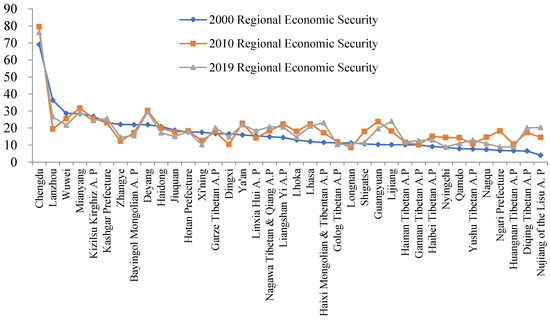 According to the economic security level of each prefecture-level city in 2000, from the highest to the lowest, the other two curves of the economic security of cities in 2010 and 2019 were made (Figure 6). The figure shows that the RES curve in 2010 is similar to 2019, and there is a significant change in 2000, which means that the economic security of prefecture-level cities changed greatly from 2000 to 2010, and then was stable afterward. It also presents path dependency, that is, the economic security level of a city in the early stage may affect its changes in the later stage, which consequently shows a tendency that “the strong are always strong, while the weak are always weak”. Moreover, there are fluctuations in some parts of the curves, mainly in the higher level parts and the lowest level parts. Some former cities improved their economic security during this period, such as Haixi Mongolian Autonomous Prefecture, Ya’an, Guangyuan, Diqing Tibetan Autonomous Prefecture, Lijiang, Lhasa in Tibet and Garze, Nagawa, and Liangshan prefectures; while the latter cities have significantly decreased in RES in 2019, compared with 2010, such as Lanzhou, Wuwei, Zhangye in Gansu province, and Nagqu, Shigatse, Qamdo, Ngari Prefecture, Nyingchi in Tibet Autonomous Region.