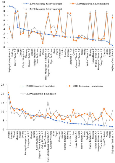 (1) Economic growth. The Qinghai–Tibet Plateau has a weak economic foundation and depends on financial support from the central government and counterpart support of the eastern provinces. Especially with the national strategy of “Western Development of China” since the late 1990s, the construction of infrastructure and the provision of public services has increased with a large number of investments, which stimulates economic growth and promotes local income levels. Therefore, this paper selects GDP growth rate and fixed asset investment growth rate as secondary indicators [23,50].