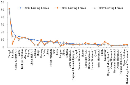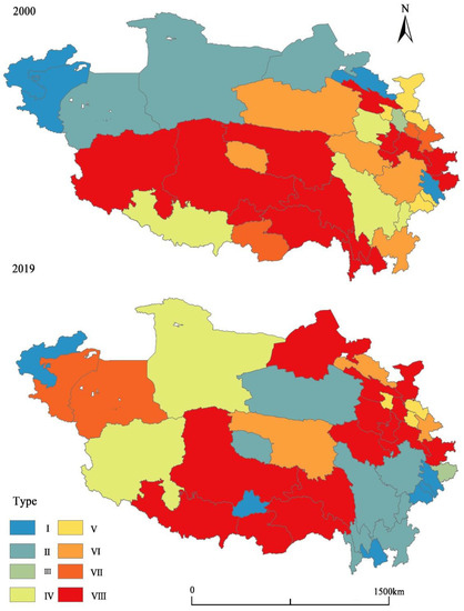 Figure 10 shows that Type 2, Type 6, and Type 8, having something in common in the low level of driving forces, are the main types with an increasing trend, and these three types of prefecture-level cities are spatially clustered and contiguous in 2019 and 2000, though the specific prefecture-level cities in each type vary considerably. Among them, Type 8 occupied a large proportion in both 2000 and 2019, and this type of prefecture-level city was mainly distributed in the Tibet Autonomous Region. It shows that many prefecture-level cities in this region still face serious problems of fragile ecology, scarcity of economic factors, weak economic foundation, and driving forces. Type 6 prefecture-level cities are mainly distributed in Qinghai and Gansu Provinces, and Type 2 prefecture-level cities have ‘shifted’ from the northern edge to the southeastern edge of the Qinghai–Tibet Plateau.