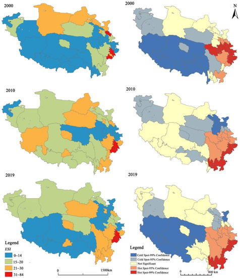 The results of the global auto-correlation analysis are shown in Table 4. Generally, when the Moran’s I index is higher than 0, the Z score is higher than 1.65, and the p-value is less than 0.10, it belongs to the significant high-value clustering. According to the Z scores and the p-values in Table 4, Moran’s I index has an upward trend, increasing from 0.064892 in 2000 to 0.172454 in 2019, which indicates that the economic security of the Qinghai–Tibet Plateau shows a feature of increasing geographical agglomeration and spatial correlation. The economic security level of one prefecture-level city affects that of its neighboring cities; prefecture-level cities with a good foundation of economic security tend to conglomerate geographically and get better and better, while those with a poor economic foundation, resources, environment, and driving forces are always in a relatively poor situation. Consequently, the “Matthew effect (The Matthew effect refers to any individual, group or region, success and progress in a certain area can produce a cumulative advantage, and then can obtain more opportunities to achieve greater success. It mainly reflects the phenomenon of polarization and growing differences.)” may appear, and the difference in the economic security between cities with high levels and those with low levels would increase further.