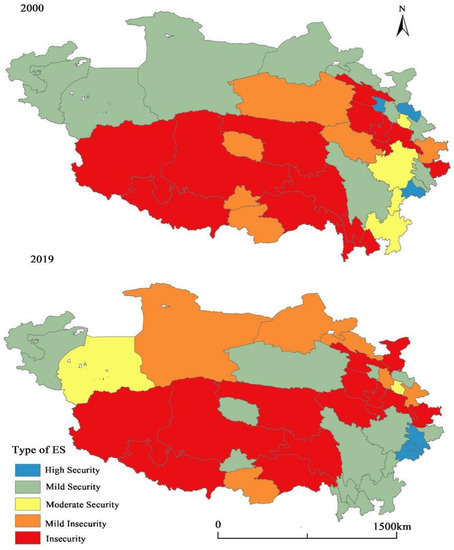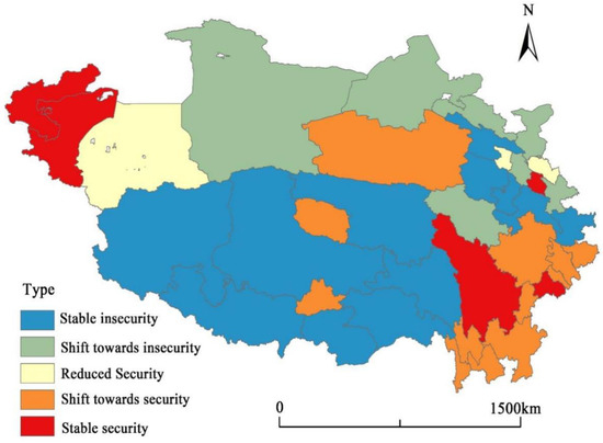 Spatial Pattern of Fractal Dimension Indexes Types of the Economic Security in the Qinghai–Tibet Plateau in 2000 and 2019.