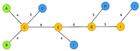 Main path analyses can be used to process large numbers of citation data and review key knowledge in any academic field. Main paths connect the source (starting) and sink (ending) points in the literature. Main paths are identified by measuring the traversal counts of each path through search path count, search path link count (SPLC), and search path node pair [21]. This study referenced Liu and Lu (2012), who used global main paths and key route main paths. SPLC is superior to search path count and search path node pair [22], because it maps knowledge diffusion more effectively. Figure 1 presents the process of main path analysis based on SPLC weights. First, a path in the network is selected. The number of paths connecting source points and nodes to sink points and the number of possible paths connecting sink points to each node are multiplied to obtain the weight of each link.