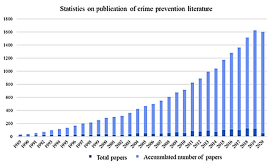 Figure 2 presents an Excel chart of the number of studies published each year and total number of studies on crime prevention from 1989 to 2020 in dark and light blue, respectively. The number of studies consistently increased. By 2015, the growth was exponential, and hundreds of studies were being published annually. This signifies that crime prevention began to garner more attention.