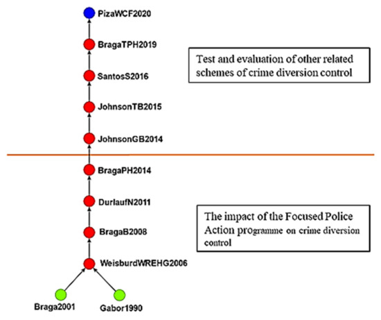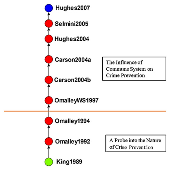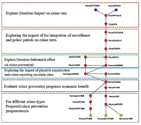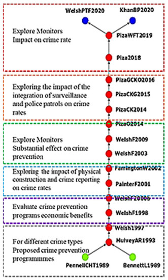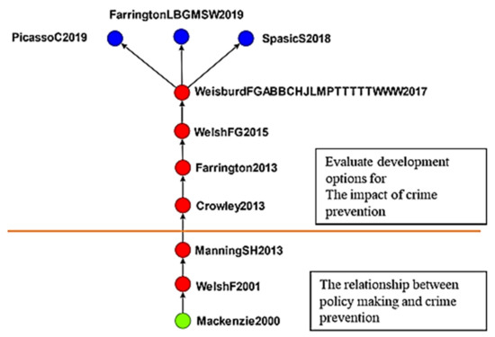 Figure 3 depicts the global main path of crime prevention in the academic field. The main path of the citation network had the highest total weight and consisted of 18 nodes, each representing a study. Pennell et al. [23] assessed the effects of the Guardian Angels Program (i.e., volunteers patrolling the streets and subways) on crime and citizens’ attitude toward crime; order maintenance policing helped prevent crime and made citizens feel safe. Bennett and Lavrakas [24] proposed a community-based crime prevention program to eliminate the fear of crime and other problems but did not observe any changes in crimes or perceived quality of life. Mulvey et al. [25] reported that interventions must be broadly based and assessed more comprehensively to deter juvenile delinquency. Graham and Bennett [26] explored situational and community crime prevention programs in Europe and North America and their implementation effects.