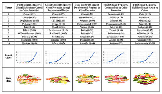 The fourth cluster consisted of 59 studies on crime prevention and communalism (Figure 9). King [74] detailed the relationship between France’s crime prevention strategies and antisocial behavior. Omalley [75] reported that the rise of neoconservatism discouraged the development of programs based on risk models and examined situational crime prevention in relation to neoconservatism. Omalley [76] defined crime prevention as a key responsibility, advocated for the causes of crime to be studied, and indicated that criminals should take responsibility for their crimes. The study also proposed strengthening the law to enhance its punitive function.