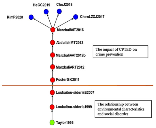 An edge-betweenness cluster analysis yielded 20 clusters, and studies in the top 5 clusters, namely the effects of crime displacement control on crime prevention, the effects of crime prevention through environmental design (CPTED), the effects of developmental programs on crime prevention, the effects of communalism on crime prevention, and the effects of childhood sexual abuse on crimes, were input into Wordle to identify keywords. Figure 5 presents the themes, number of studies, keywords, and word clouds for these clusters. Keywords were ranked by their frequency (numbers in parentheses) in titles; for example, “crime” appeared an average 0.33 times in the first cluster. The studies in each cluster were analyzed to determine the main path of each cluster and the research direction of each main path (Figure 6, Figure 7, Figure 8, Figure 9 and Figure 10). The literature growth trend charts revealed that the number of studies in the literature increased in all five clusters.