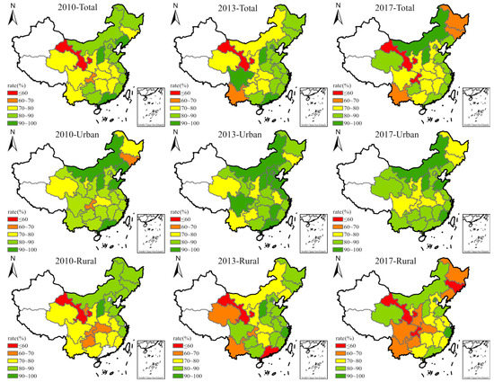 - The SRHS showed significant spatial gradient distribution characteristics. The health status of people in the eastern coastal areas was relatively higher than those in other areas, and the healthy ratio consistently remained above 80% (Figure 1). In the central region, except for Shanxi, the health level was relatively high, but other provinces reported mid-levels of health. The western region had poor health status—the proportion of healthy people in Gansu never exceeded 60%, possibly related to the outdated public services in that region. The health levels of Heilongjiang and Jilin in Northeast China declined each year, which may be related to the serious population outflow and increased aging population in Northeast China. When the sample was divided into urban and rural groups, the spatial gradient of health status became more obvious, especially the health status of rural residents. Urban residents’ health status was generally high, and the areas with lower health levels gradually shrank. Rural residents showed the opposite trend. The proportion of unhealthy groups and regions continue to expand, and the health status of rural residents in the northwest, southwest, and northeast regions was poor.