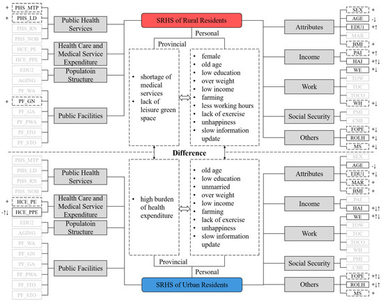 Figure 4. The comparison of the impact mechanism of the self-rated health status of urban and rural residents. Different types of box styles represent different influences: a solid line box with a significant impact all time; a dash line box with a significant impact in some years; an almost invisible box with no impact. The symbol “+” indicated a positive impact, and the symbol “-” indicated a negative impact. The symbol “↑” indicated the influence was gradually enhanced, and the symbol “↓” indicated the influence was gradually weakened.