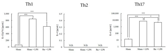 Effects of radon (Rn) inhalation on lipopolysaccharide (LPS)-induced T cell differentiation-inducing cytokines in serum. The results are presented as the mean ± standard error of the mean (SEM). N = 7; all experiments were conducted once; * p < 0.05, *** p < 0.001; IL, interleukin; N.D., not detected; sham, mouse group without any treatment; sham + LPS, mouse group that inhaled sham followed by LPS (1 mg/kg body weight); Rn + LPS, mouse group that inhaled radon (2000 Bq/m3) followed by LPS (1 mg/kg body weight).
