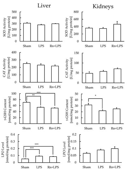 LPS administration induces damage in the brain [,], lungs [], heart [], liver [], pancreas [], kidneys [,], and intestines []. Thus, oxidative stress and inflammation may play important roles in the development of LPS-induced damage. However, the dose of LPS used varies according to the animal model. In the present study, we determined the administration dose of LPS in a preliminary study (Figure A1). To further evaluate LPS-induced oxidative stress in each organ, we assayed antioxidative substances in the brain, lungs, heart, liver, pancreas, kidneys, small intestine, and large intestine. The LPO levels showed that LPS administration induced oxidative stress in the lungs and liver. Specifically, t-GSH levels were decreased in the liver, demonstrating that oxidative stress is much stronger in the liver than that in any other organ. The kidneys were also damaged by LPS administration, as observed by the decrease in t-GSH content. However, radon inhalation did not alleviate the LPS-induced oxidative stress under the present experimental conditions.