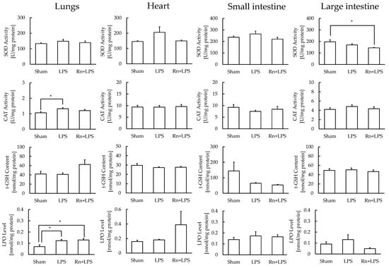 Effect of radon (Rn) inhalation on oxidative stress associated with lipopolysaccharide (LPS) administration in the lungs, heart, small intestine, and large intestine. The results are presented as the mean ± SEM. N = 6–7; * p < 0.05; all experiments were conducted once; * p < 0.05; sham, mouse group without any treatment; sham + LPS, mouse group that inhaled sham followed by LPS (1 mg/kg body weight); Rn + LPS, mouse group that inhaled radon (2000 Bq/m3) followed by LPS (1 mg/kg body weight); SOD, superoxide dismutase; CAT, catalase; GSH, glutathione; LPO, lipid peroxide.
