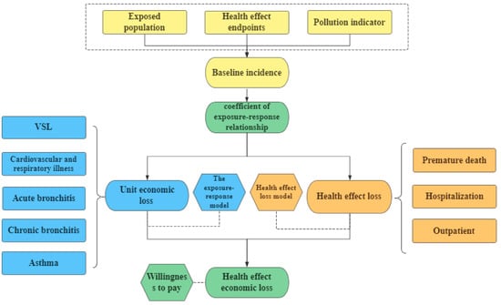 Therefore, this paper adopted the ambient air quality standard (GB3095-2012), combined with the epidemiological survey data of atmospheric particulate pollutants at home and abroad, based on which the exposure-response model was used to quantitatively analyze the health effects of urban residents in the ‘2 + 26’ cities due to PM2.5 pollution and to evaluate the economic loss caused by the health effects of cities in each region (Figure 1). In addition, the determination of ‘2 + 26’ cities refers to the comparison and reference of pollution between different regions and considers the calculation results within the ‘2 + 26’ area by city and disease terminal to achieve a multi-faceted and three-dimensional comprehensive analysis, which was the innovation of this paper.