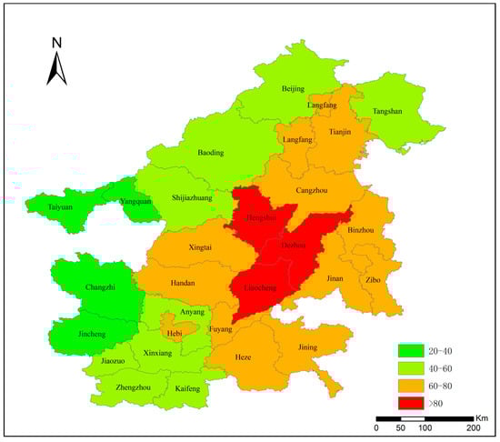 Average PM2.5 concentration of ‘2 + 26’ cities in 2020 (μg/m3). (Data source: China Environmental Monitoring Station, 2020).