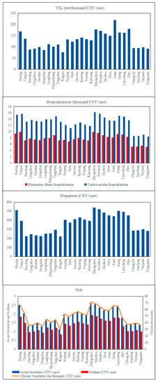 According to the currently available and reliable unit health economic loss value in China, taking the results of Xie [22] into account and adopting the VSL of Beijing as the benchmark data, this paper calculated each city’s VSL based on the income ratio compared to Beijing. Considering that the scope of the ‘2 + 26’ cities was wide and the income level was quite different, the average annual income of the urban population was selected as the weight. In addition, the VSL in Beijing was assessed to obtain the unit health economic loss value in the ‘2 + 26’ cities. Similarly, for the definition of the economic value unit of respiratory disease hospitalization, cardiovascular hospitalization, acute bronchitis, internal medicine clinics, pediatric clinics, and asthma, the disease cost method was mainly used. The cost conversion of each individual disease contained the direct medical cost conversion and the indirect social cost conversion. This paper used the World Bank’s method in Equation (4) to quantify the unit loss of each chosen health effect terminal. According to the China Health Statistics Yearbook in 2020, National Health Service survey data and the ratio of income of urban population in ‘2 + 26’ area in 2020, this paper calculated the unit medical expenses and the loss time of cardiovascular disease, respiratory disease hospitalization, outpatient medical department, and outpatient pediatrics as the unit economic loss value.