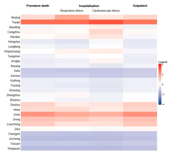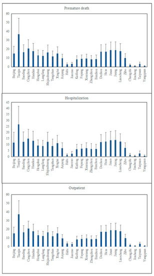 Due to the different levels of economic development in different cities and the uneven distribution of population density and air pollution within the ‘2 + 26’ cities, the health effect loss caused by PM2.5 is also different, showing regional differences. PM2.5 exposed the residents to a greater health threat. It can be seen from Figure 4 that different chosen health effect terminals had different sensitivities to PM2.5 pollution. The number of the residents affected by PM2.5 in ‘2 + 26’ cities was about 9397 (3988, 14,084) thousand. As for premature death, there were about 3412 (1654, 5114) thousand cases of premature death from PM2.5, which accounted for the largest proportion compared to other diseases. While the number of cases of chronic bronchitis was 216 (193, 247) thousand, the proportion of chronic bronchitis accounting for the total economic loss was the smallest, which was 216 (193–247) thousand cases. It can be concluded that, among all the negative impacts, the number of outpatient cases was the largest compared to other health effect terminals. The cases of premature deaths due to PM2.5 pollution were slightly fewer than those of the outpatient, showing that both two health effect terminals had a similar sensitivity to PM2.5 pollution. In addition, the cases of hospitalization also accounted for a great proportion that cannot be neglected.