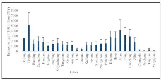 As the economic growth level of each city was different, and the population intensity and air pollution degree were unevenly distributed within ‘2 + 26’ cities, the economic loss from PM2.5 was also different. It is revealed in Figure 6 that the loss of Tianjin, Jinan, and Jining were the largest, CNY 509.764 billion, CNY 481.83 billion, and CNY 314.84 billion, respectively, with a total economic loss of CNY 1244.44 billion, accounting for 26.7% of the total economic loss of ‘2 + 26’ cities in 2020. On the contrary, Jincheng and Yangquan in the Shanxi Province accounted for the lowest proportions of the health effect economic loss, which were both less than CNY 10 billion, CNY 9.145 billion, and CNY 9.605 billion, respectively. According to the ratio of the economic loss to GDP in each city, Baoding was the largest, with 8.62%, followed by Cangzhou, with 6.80%. The smallest were in Jincheng and Yangquan, which were 0.87% and 0.69%, respectively. Overall, the health effect economic loss was small in the east and large in the west, with larger loss in the north and south but smaller loss in the middle of the ‘2 + 26’ region.