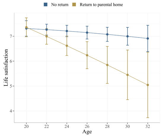 Adjusted predictions of life satisfaction scores by the return to parental home and age of respondents. The model adjusted for gender and employment situation. N = 913.