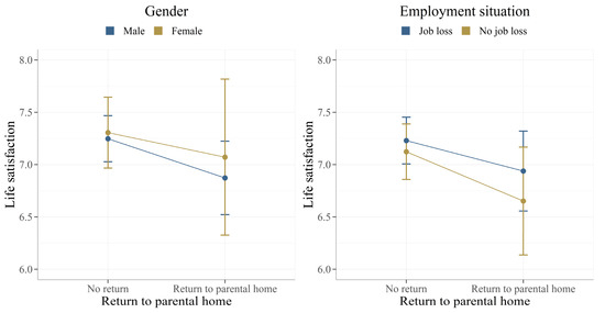 Finally, the association between life satisfaction and returning to the parental home does not differ between genders or employment situations in a statistically significant way (Figure 2). Specifically, returning to the parental home is not differently associated with life satisfaction in both male and female students (left panel of Figure 2). Moreover, job loss does not interact with the negative association between life satisfaction and returning to the parental home. Compared to students who did not lose their job, we did not find a different association between life satisfaction and the return to the parental home for students who lost their job during the COVID-19 pandemic (right panel of Figure 2). The detailed regression results for all interaction models are summarized in Table S1 (Supplementary Materials).