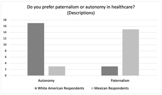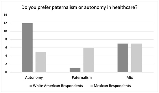 APA StyleThompson, G. A., Segura, J., Cruz, D., Arnita, C., & Whiffen, L. H. (2022). Cultural Differences in Patients’ Preferences for Paternalism: Comparing Mexican and American Patients’ Preferences for and Experiences with Physician Paternalism and Patient Autonomy. International Journal of Environmental Research and Public Health, 19(17), 10663. https://doi.org/10.3390/ijerph191710663