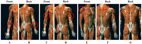 The muscle activity of each body region was measured using the EMG (Telemyo Desktop DTS System, Noraxon Inc., Scottsdale, AZ, USA; gain = 500, noise < 1 µV, sampling rate = 1500 Hz). The raw EMG data were processed using Noraxon MR3 3.12.42. software. The EMG signal was processed according to the following steps: filtering, rectification, and smoothing algorithm. The type of signal was band-pass, and the range of frequency was 20–400 Hz. Used filter was finite impulse response, and window were 79 points and lancosh. The smoothing algorithm was the root-mean-square and the window was 100 ms. Before the measurement were taken and after cleaning the attachment site with an alcohol swab, all the four participants had electrodes placed on them, parallel to the muscle fiber direction. An EMG evaluation was performed at seven different locations by attaching electrodes to the flexor carpi ulnaris, extensor carpi radialis, biceps brachii, lateral triceps, middle deltoid, upper trapezius, and erector spinae (Figure 3), with the attachment locations selected according to the SENIAM guidelines [15].