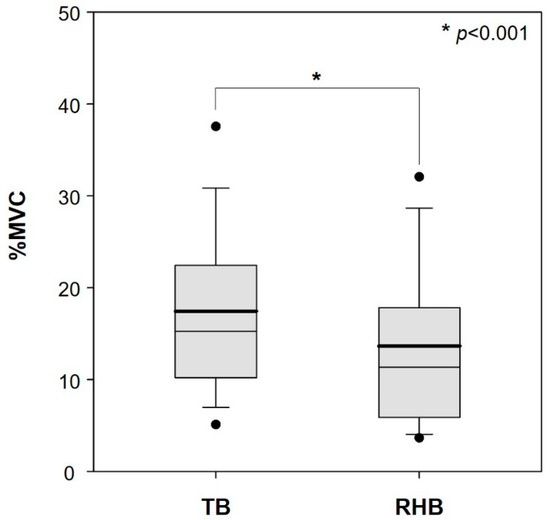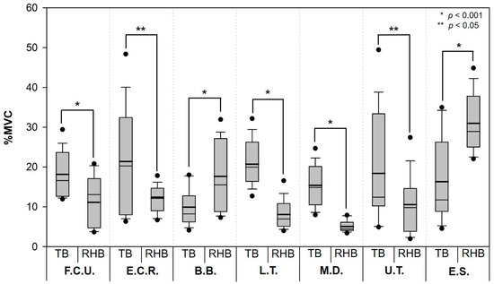 Figure 4 shows the EMG results for all seven muscles. The total muscle activity decreased significantly when the RHB was used (AM, 13.6% MVC; SD, 9.8% MVC) compared with the activity recorded during the use of the TB (AM, 17.4% MVC; SD, 9.7% MVC) (p < 0.001).