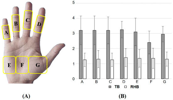 The LPD scores for each of the seven regions of the hand are shown in Figure 6. The participants’ response to using the TB was that of very high discomfort in all the regions (AM, 3.1 to 3.25 points) except for F and G (AM, 2.4 and 2.95, respectively; moderate discomfort), while they expressed very little discomfort in the entire hand when using the RHB (AM, 1.25 to 1.40), confirming the tendency of a decrease in the score.