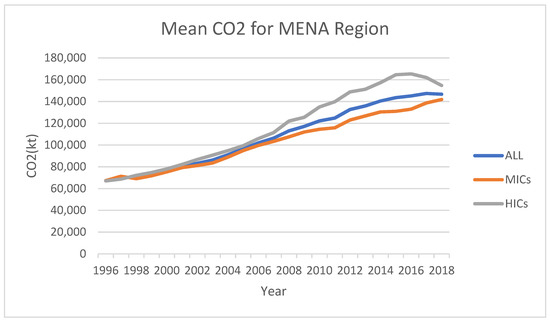 An examination of the data reveals that, on average, HICs in the MENA region reached their CO2 peak years in 2016 (as shown in Figure 1), with a per capita income approximately USD 25,000.00. Furthermore, the selected MENA countries, as a whole, hit their peak period in 2017 (albeit statistical significance is weak) with an income per capita of approximately USD 16,000.00. However, given the weak responsiveness of CO2 to EGR, as shown by the elasticities in Table 10, achieving the net-zero emission target in the MENA region would be challenging. Furthermore, since their peaks up to 2018, CO2 levels in HICs and all selected MENA countries have decreased by about 800 kt and 1000 kt, respectively. This finding is consistent with Lamb et al. [97] who found weak evidence for EKC among richer countries.