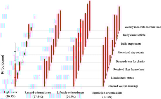 Class 4, labeled as interaction-oriented users (17.3%), included moderate WeRun users that differed from reward-oriented users (who had a higher likelihood of donating and monetizing step counts, but a lower likelihood of interacting with WeRun friends) in that these individuals had a higher likelihood of liking each other, but they were less interested in donating steps to charity and monetizing step counts.