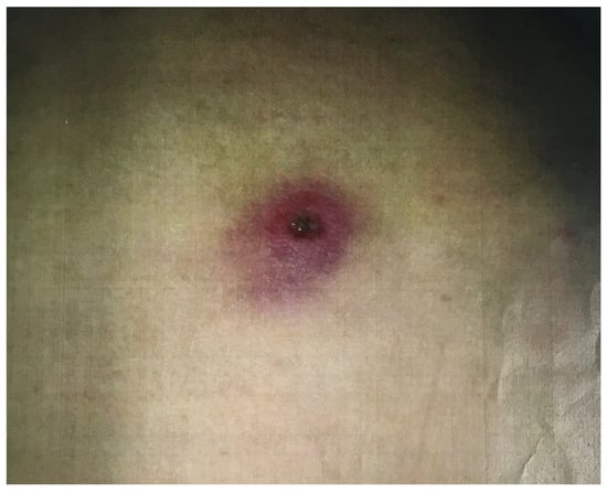 Due to the obvious travel history, another thorough physical examination was performed on the patient, which revealed erythema on the right buttock, with a central skin lesion forming a black crust over the ulcer (