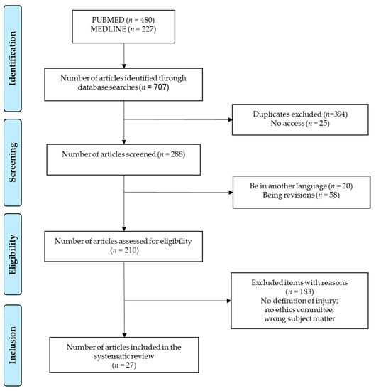 - Pfirrmann, D.; Herbst, M.; Ingelfinger, P.; Simon, P.; Tug, S. Analysis of Injury Incidences in Male Professional Adult and Elite Youth Soccer Players: A Systematic Review. J. Athl. Train. 2016, 51, 410–424. [Google Scholar] [CrossRef] [PubMed]