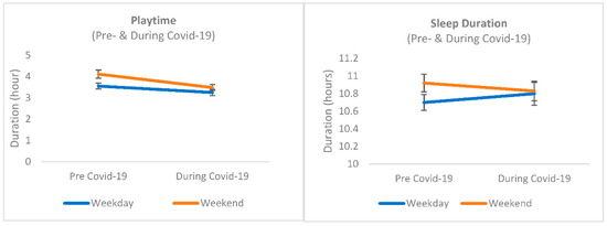 Table 2 presents information about weekday and weekend playtime and sleep duration derived from the SMALLQ® questionnaire before and during the COVID-19 pandemic. Before the COVID-19 pandemic, children’s playtime was significantly higher on the weekend than on the weekdays (4.11 vs. 3.55 h, p < 0.05 or 15.7% higher) while sleep duration was the same on the weekday and on the weekend (10.70 vs. 10.92 h, p > 0.05). During the COVID-19 pandemic, both weekday and weekend playtimes and sleep durations were not significantly different from each other (p > 0.05). This is shown in Figure 1.