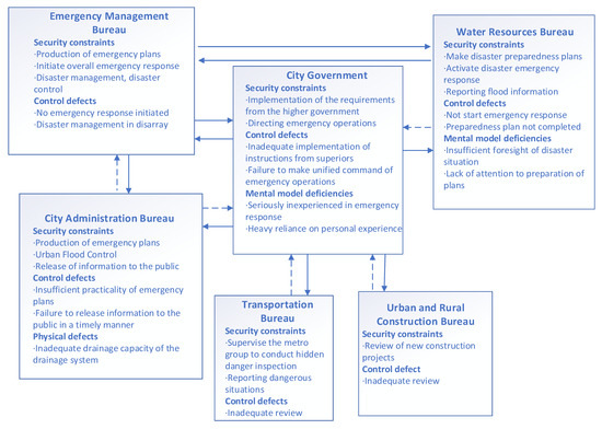 The CAST analysis of the Zhengzhou government’s emergency control structure is shown in Figure 5. The solid arrows represent effective information transmission and the dashed arrows represent invalid information transmission.