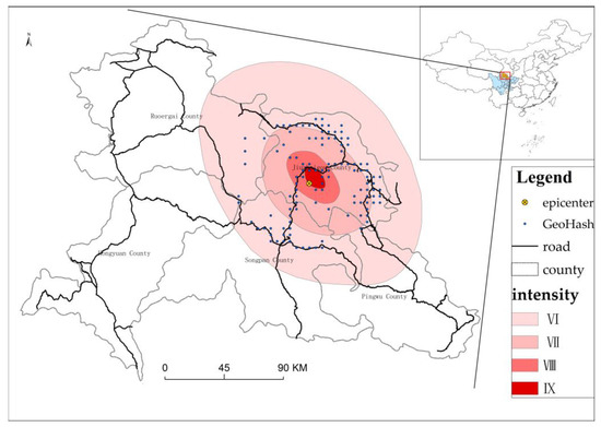 The study area is the area impacted by the Mw 6.5 Jiuzhaigou earthquake, China (Figure 1). The Mw 6.5 Jiuzhaigou earthquake occurred at 21:19:46 on 8 August 2017, with the epicenter (33.20° N, 103.82° E) located in Jiuzhaigou County, Aba Prefecture, Sichuan Province, China. This area represents the intersection of the Huya Fault on the eastern boundary of the Bayan Har Block and the Tazang Fault in the eastern section of the East Kunlun Fault Zone. The maximum intensity of this earthquake was IX degrees, the long axis of isoseismal lines trended north–northwest and the total area with seismic intensities of VI degrees and above was 18,295 km2 [38]. This study area mainly covers areas with seismic intensities of VI degrees and above in Sichuan Province, China (Figure 1).