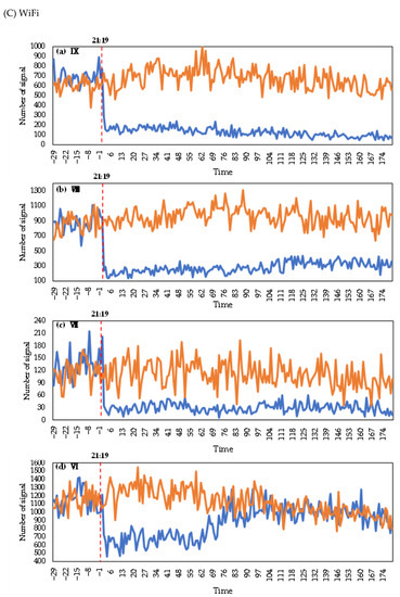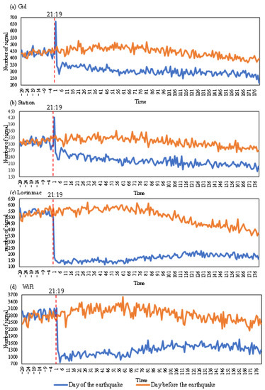 The above analysis showed that the number of devices associated with the four types of signals experienced sudden changes after the earthquake. Two abrupt change points occurred for Gid and Station. The trends of Gid and Station were similar, but the change in the Gid data was larger than that in the Station data. The magnitudes of change in Loginmac and WiFi were similar. However, the sudden decrease in Loginmac occurred at 21:20, and the sudden change lasted 5 min. The sudden change in WiFi occurred at 21:21 and lasted 3 min.