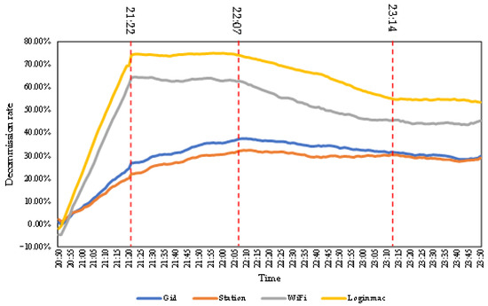 The third phase in the Gid and Station data lasted from 22:07 to 23:50, during which these signals showed small fluctuations and stable changes. Gid showed a slight downward trend from 22:07 to 23:14. The decommission rates of Gid and Station varied steadily at the same level from 23:14 to 23:50. The third phase of WiFi and Loginmac was from 22:07 to 23:14. The decommission rates showed a slight decline.