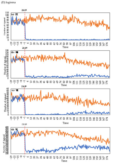The time of the Jiuzhaigou earthquake was 21:19 on 8 August 2017. From the minute-by-minute changes in the number of devices in Figure 2 and the sudden changes in the four types of signaling data in Table 3, we found that all four types of signaling data exhibited sudden changes within 3 min after the earthquake.