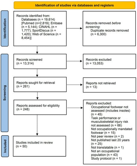 A scoping review was conducted to identify and synthesise findings from published academic works that have investigated the impact of occupational footwear on physical task performance and musculoskeletal injury risk. The literature review protocol was guided by the Preferred Reporting Items for Systematic Reviews and Meta-Analyses extension for Scoping Reviews (PRISMA-ScR) [25].