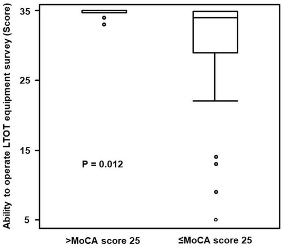 Comparison of Montreal Cognitive Assessment (MoCA) score ≤ 25 or >25 and the ability to operate long-term oxygen therapy equipment. The group of MoCA score ≤ 25 exhibited a lower ability to operate long-term oxygen therapy (LTOT) equipment survey than the group of MoCA score > 25 (p = 0.012).